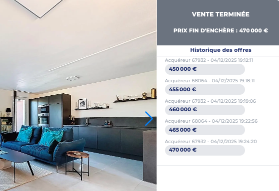 Grâce à un prix d’appel attractif sur SeLoger et des campagnes de boosting, la vente interactive maximise l’exposition des biens dès leur mise en ligne et capte rapidement l’attention du marché.