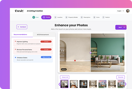 L’IA spécifique à l’immobilier de Coraly simplifie la création d’annonces grâce à des images améliorées, à la mise en scène virtuelle, à des plans 3D et à des titres et descriptions entièrement générés. Le résultat : des annonces complètes, prêtes pour le marché, qui séduisent les acheteurs et génèrent des résultats.